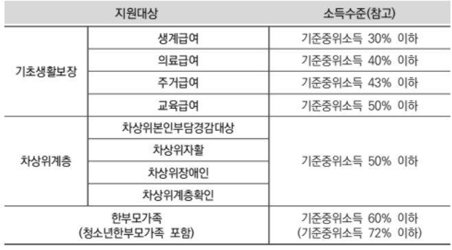• 기본 지원대상의 소득 수준을 초과하더라도 광역 시 · 도지사가 별도의 자체 기준을 정하여 추가 지원 가능